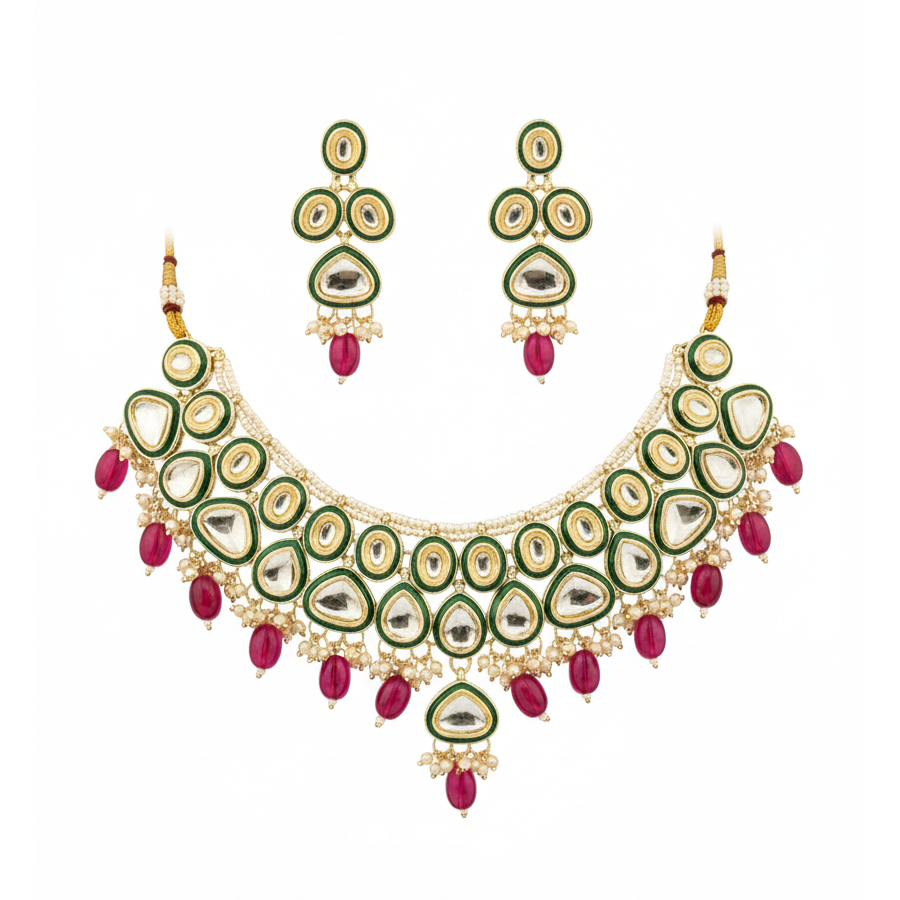 Bridal Kundan Choker Necklace Set, designed to make you shine on special occasions. The necklace features exquisite hand-crafted Kundan work, bordered with green enamel detailing and adorned with ruby-red beads and tiny pearl hangings for a rich, festive look.