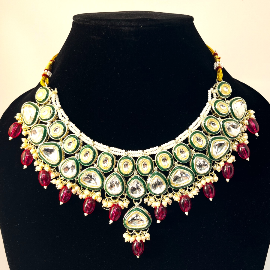 Be the first to review “Bridal Kundan Choker Necklace Set – Green Enamel with Ruby Red Beads & Maang Tikka”