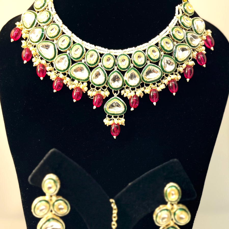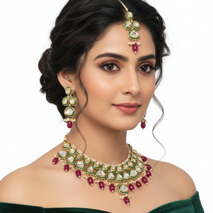 Bridal Kundan Choker Necklace Set – Green Enamel with Ruby Red Beads & Maang Tikka
