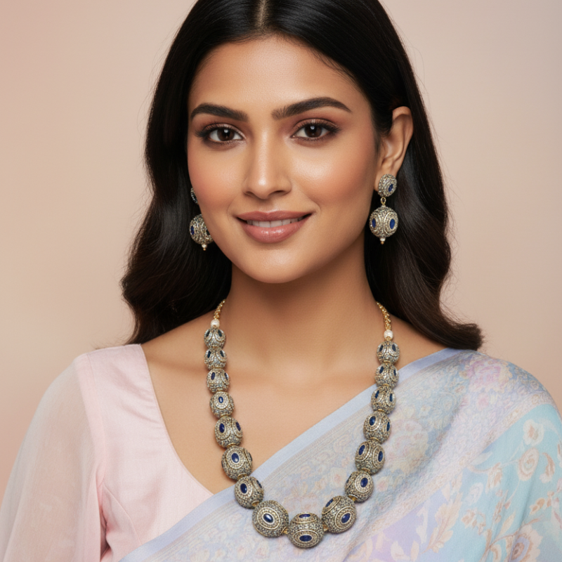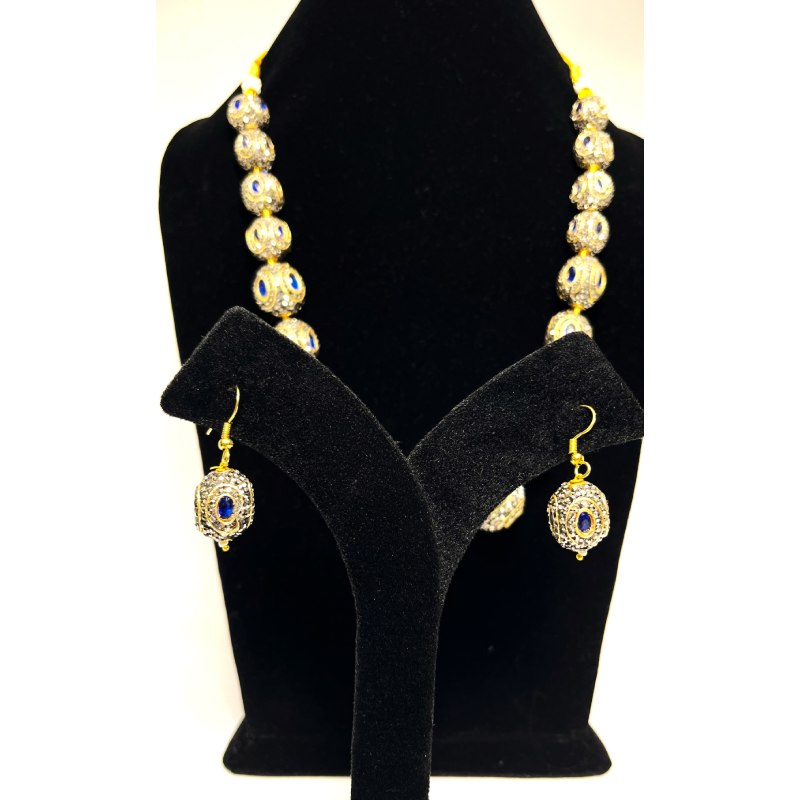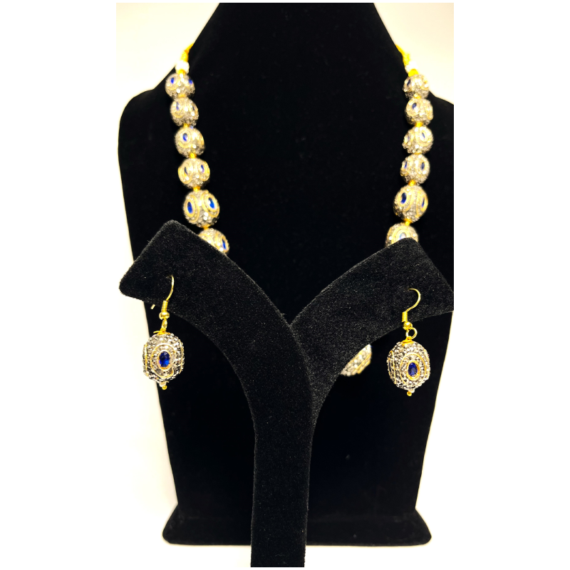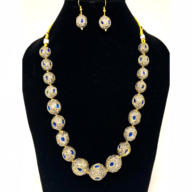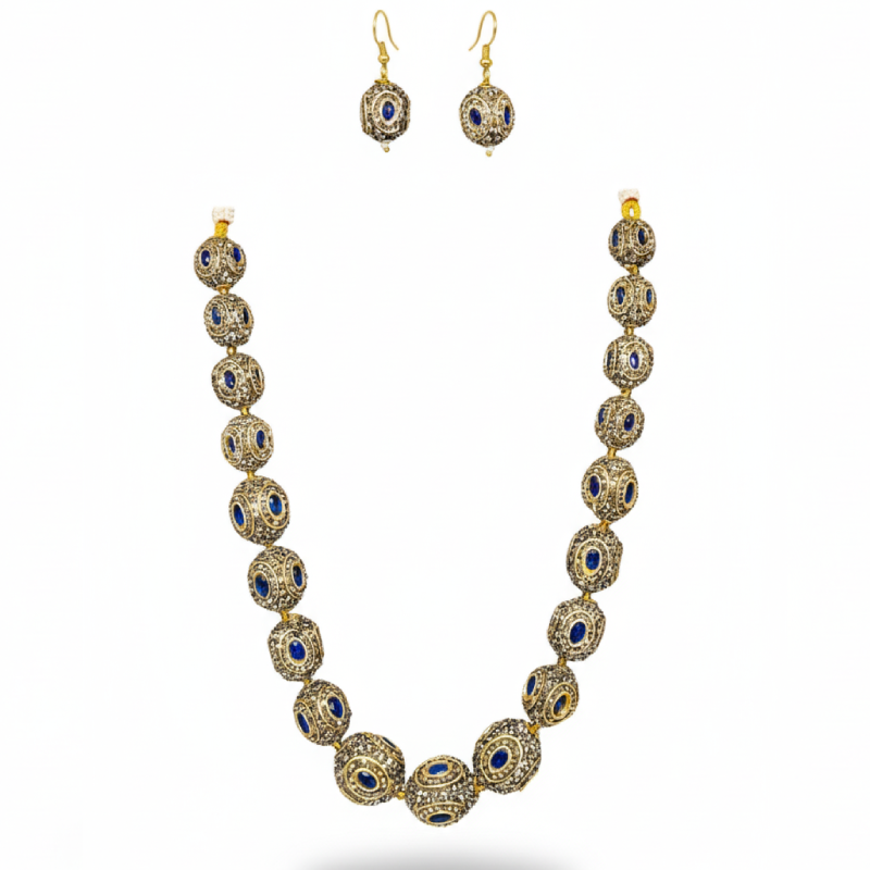Royal blue beaded necklace set, featuring intricately crafted spherical beads adorned with sparkling blue stones.