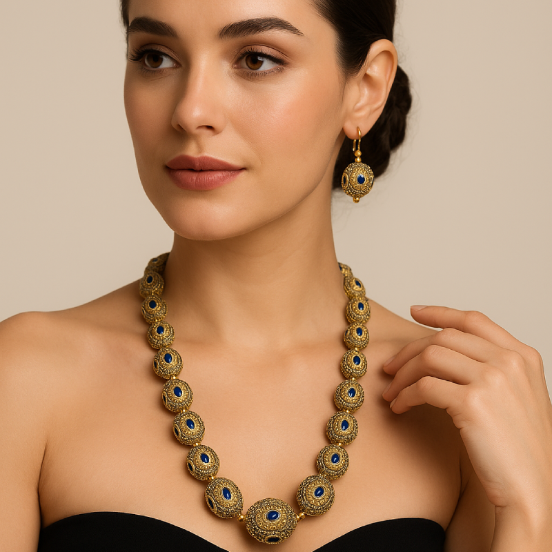 Royal Blue Beaded Necklace Set with Earrings – Antique Gold Finish Statement Jewelry