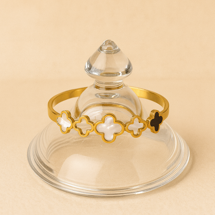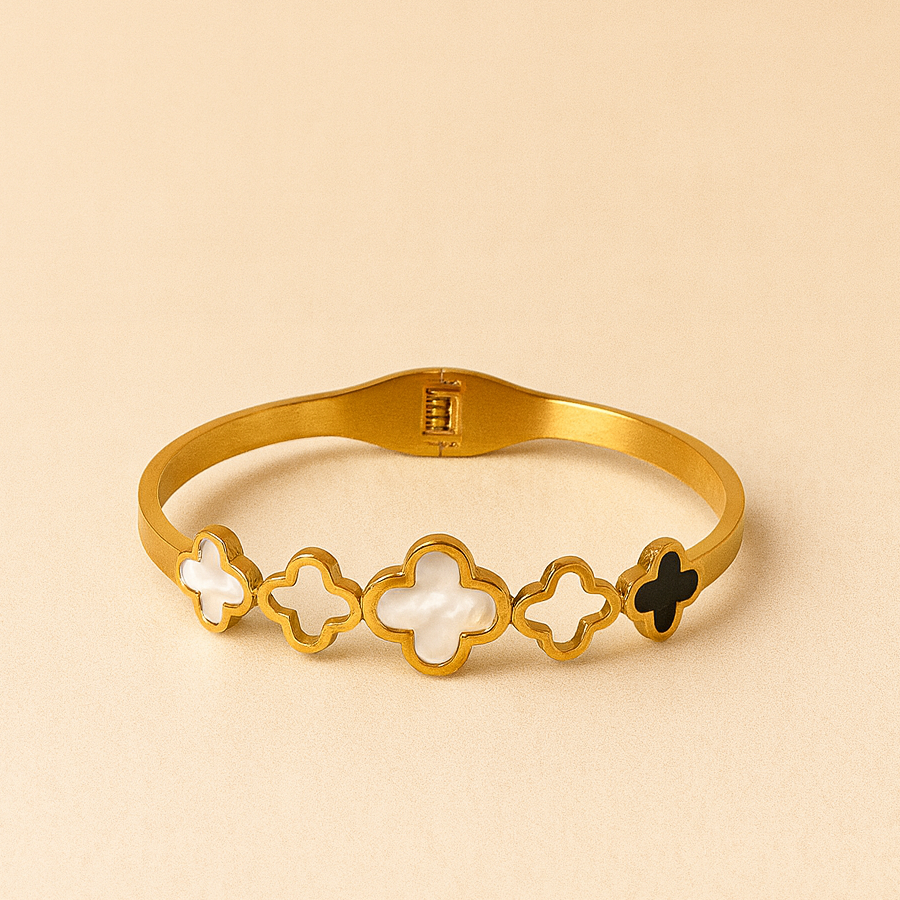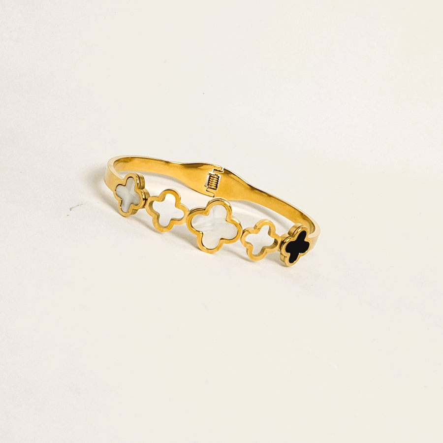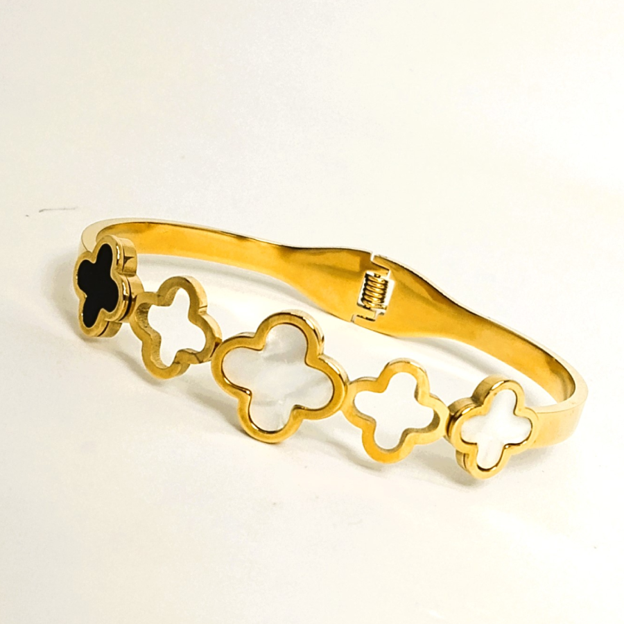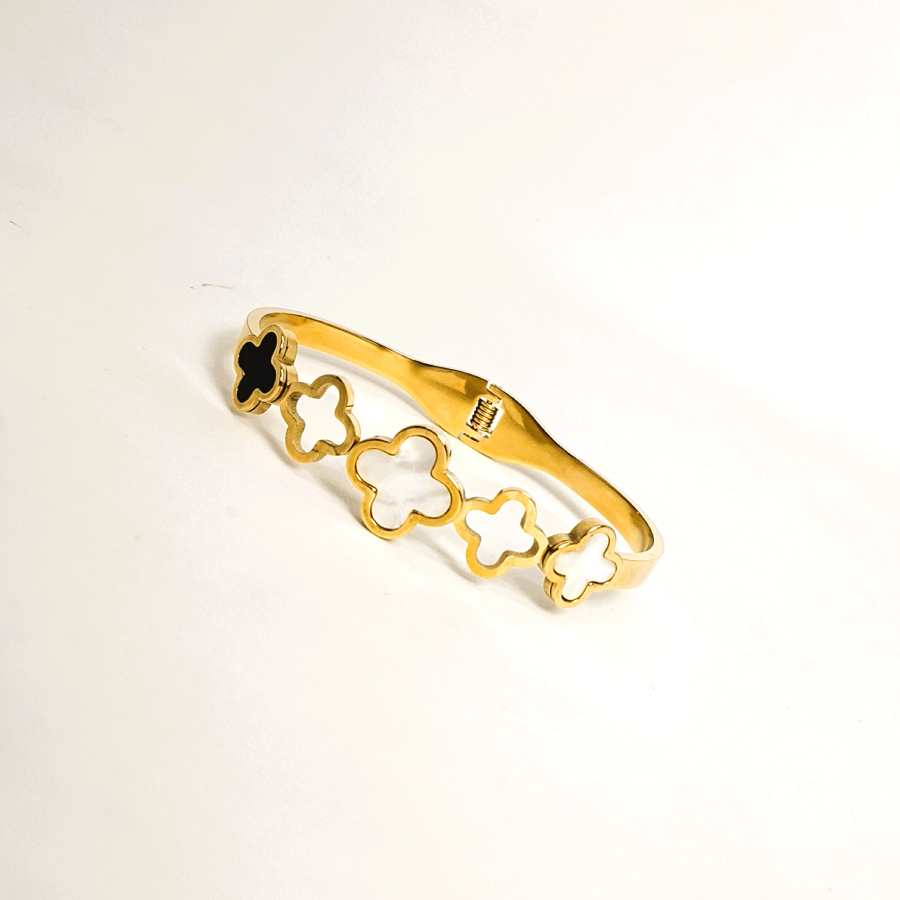 gold-plated clover bracelet, featuring a series of elegant white and black enamel clovers. Symbolizing luck and positivity, the alternating clover motifs create a striking contrast, making this bracelet a perfect blend of minimalism and luxury.