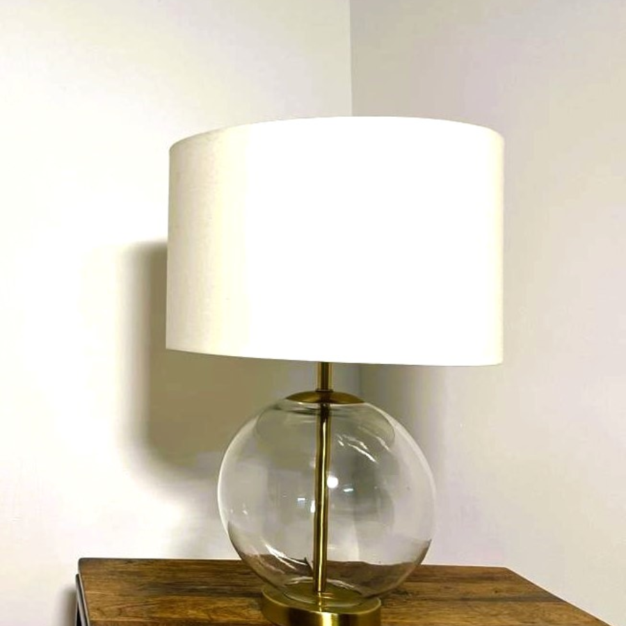 Illuminate your home with timeless elegance using this glass globe table lamp from the Toombox Luxe Lighting Collection. Featuring a clear glass body, gold metal accents, and a soft white fabric shade, this lamp adds a warm and modern charm to any space — from living rooms to bedside tables.