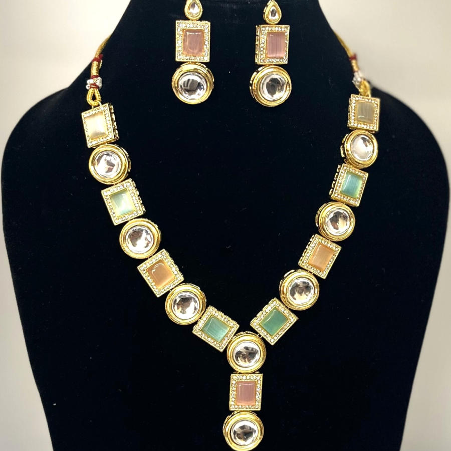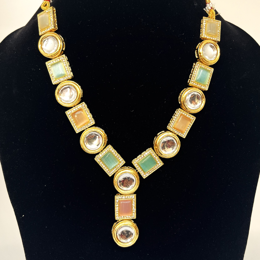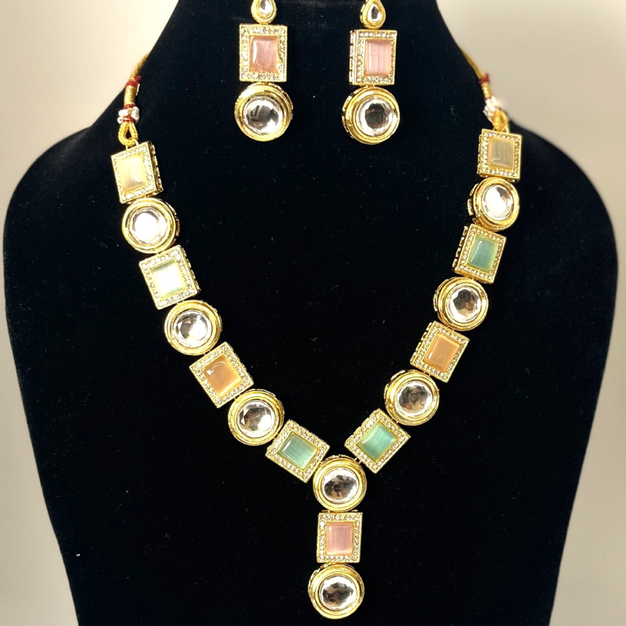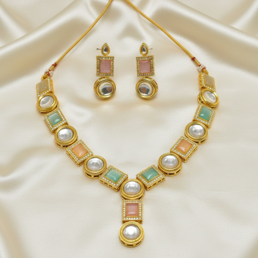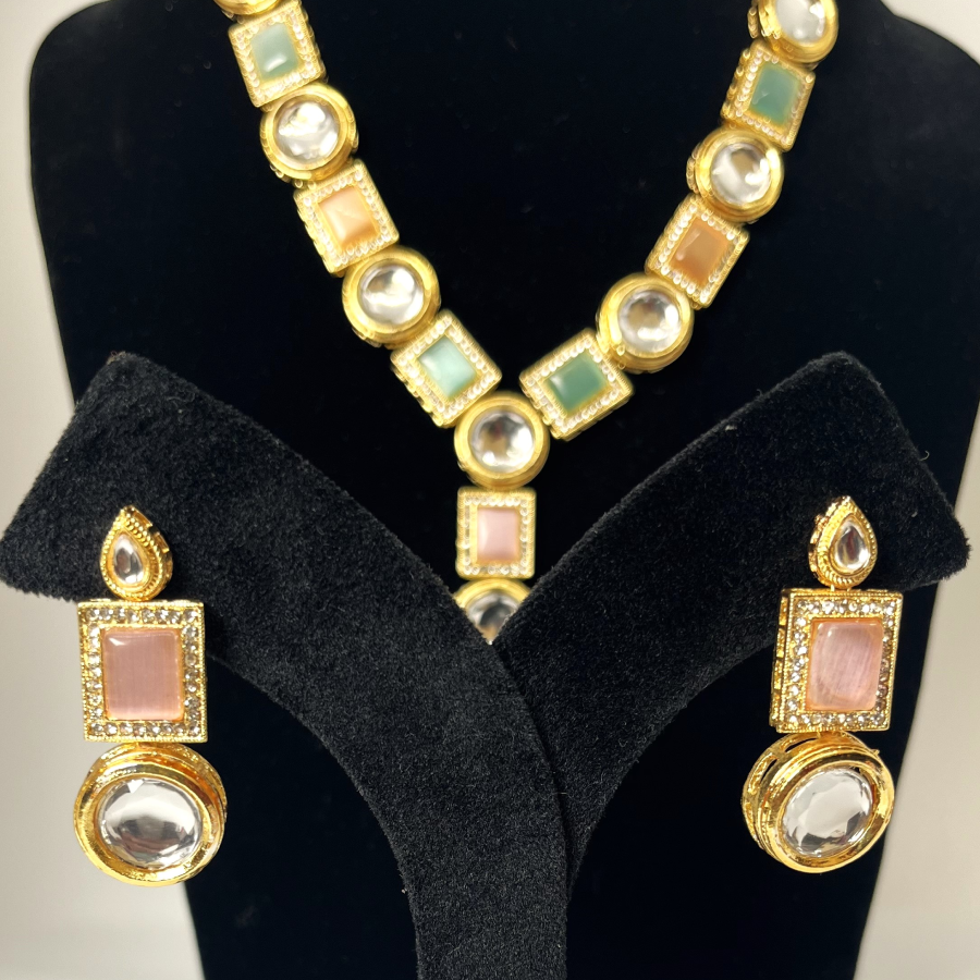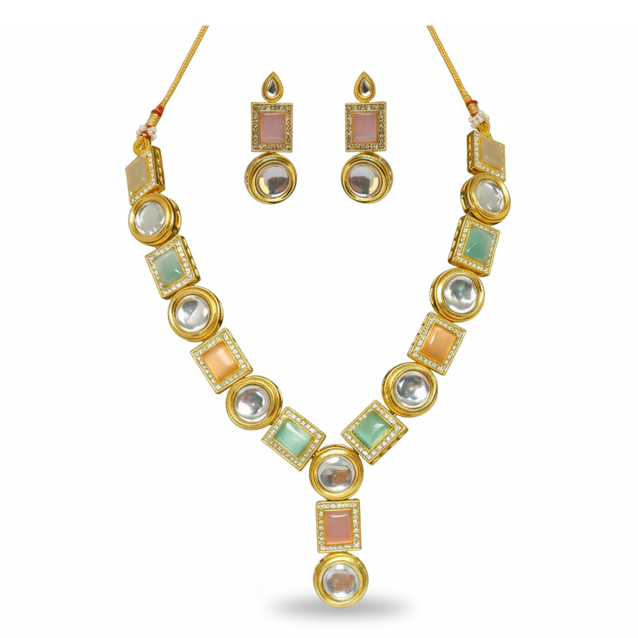 Pastel Multi-Stone Kundan Necklace Set. Designed with alternating round Kundan crystals and pastel-hued square stones in shades of peach, green, and ivory, this necklace brings a fresh and contemporary twist to traditional Indian jewelry.