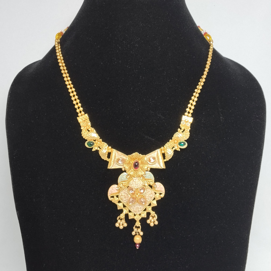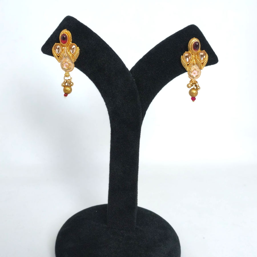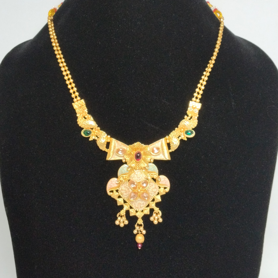 Gold Plated Necklace Set, a masterpiece inspired by temple jewelry designs. The necklace features an intricately carved pendant with floral engravings, stone embellishments, and pearl danglers that enhance its regal appeal. Accompanied by matching earrings, this set offers the perfect blend of cultural artistry and bridal elegance.