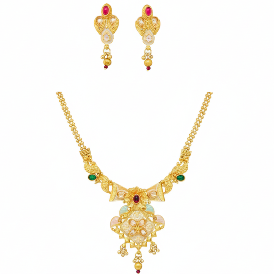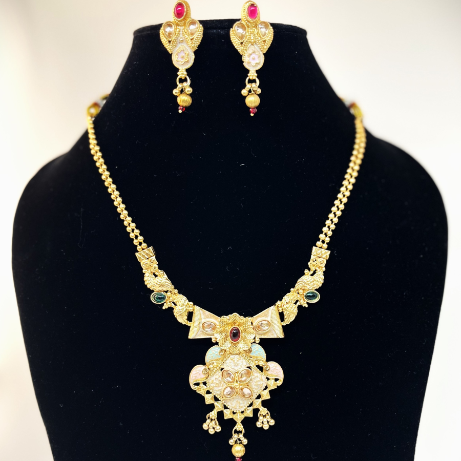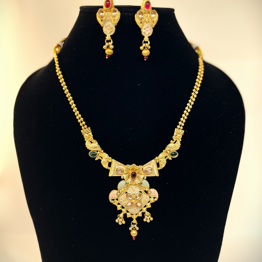 Designed to capture the richness of Indian traditions, this necklace set enhances sarees, lehengas, and festive attire with its royal charm. Lightweight yet grand, it is an heirloom-inspired piece crafted for weddings, receptions, and cultural celebrations.