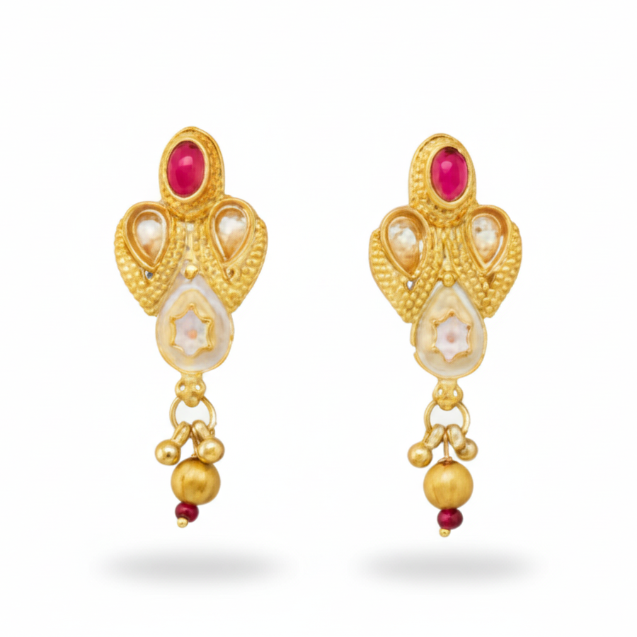 Traditional Gold Temple Necklace Set featuring intricate temple-style motifs, embedded stones, and antique craftsmanship. The necklace is beautifully detailed with engraved patterns, colored stone embellishments, and dangling bead drops that add regal elegance. Paired with matching statement earrings, this set is perfect for completing any festive or bridal look.